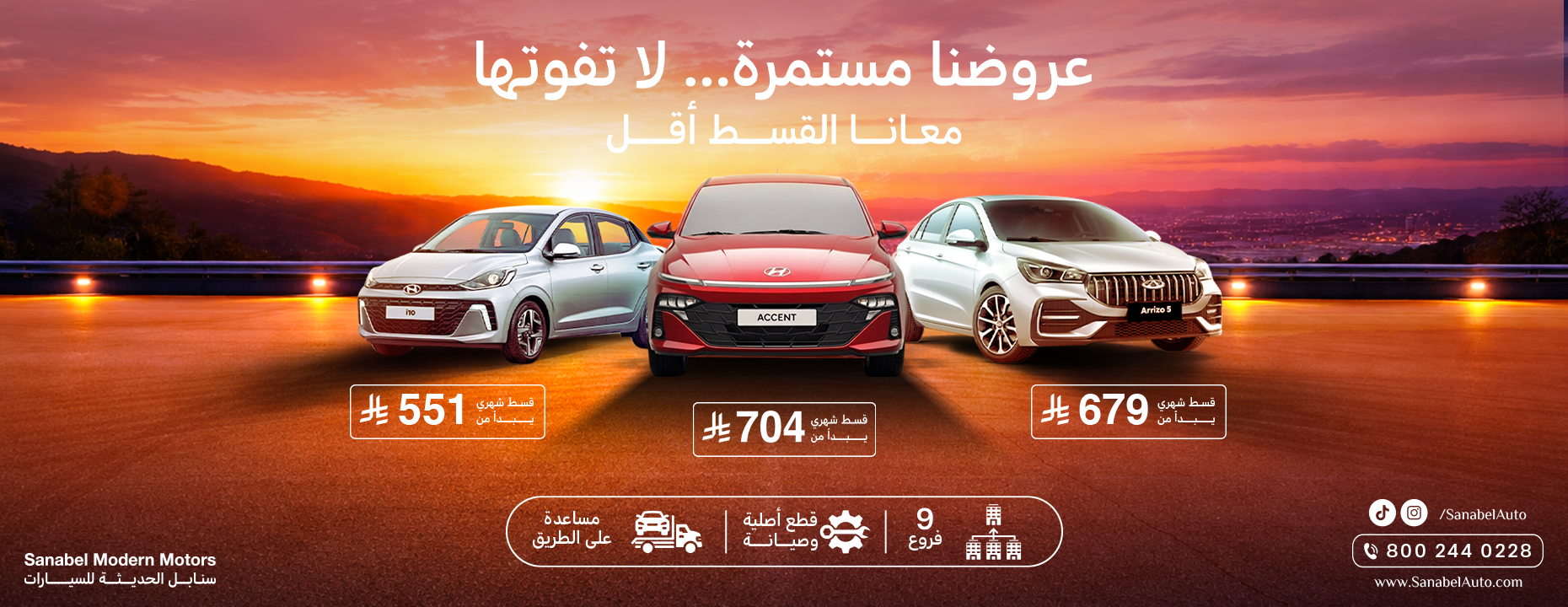 تقدم لكم سنابل الحديثة للسيارات الحل الأمثل للتنقل بأقل التكاليف. استمتع بمجموعتنا من السيارات الصغيرة والاقتصادية بأقساط شهرية تناسب الجميع دون استثناء. قيمة لا تضاهى: أقساط شهرية تبدأ من 551 ريال سعودي فقط. ملكية مريحة: العرض يشمل قطع غيار أصلية وخدمات صيانة متكاملة. دعمك رفيقك: خدمة المساعدة على الطريق متوفرة على مدار الساعة. خدمة قريبة: تفضل بزيارة أي من فروعنا الـ 9 المنتشرة لخدمتكم.